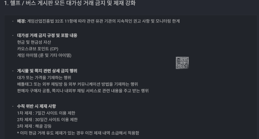 바로, 게임산업진흥법 32조 11항에 따라서 현금 및 현금성 자산은 거래 금지 규정에 포함되기 때문이다. 카오스큐브 CP는 이 사이트에서 포인트로만 사용하는 게 아니라 아이템 매니아 등을 통해서 현금으로 판매하기도 하고, CP 자체도 1:1 비율로 현금 충전이 가능하기 때문에 현금 및 현금성 자산으로 취급하는 듯하다.